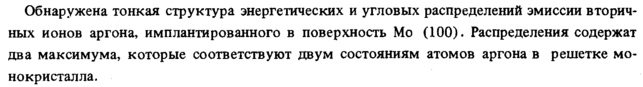 Обнаружена тонкая структура энергетических и угловых распределений эмиссии вторичных ионов аргона, имплантированного в поверхность Мо (100). Распределения содержат два максимума, которые соответствуют двум состояниям атомов аргона в решетке монокристалла.