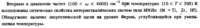 Впервые в диапазоне частот (100 < ω < 4000) см" при температурах (10 < Τ < 300) К исследованы оптические свойства интерметаллических систем типа MNiSn (Μ = Ti, Zr, Hf). Обнаружено наличие энергетической щели на уровне Ферми, углубляющейся при уменьшении температуры.