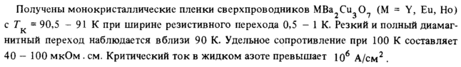 Получены монокристаллические пленки сверхпроводников МВа Си О (Μ = Y, Ей, Но) с Τ = 90,5 91 К при ширине резистивного перехода 0,5 1 К. Резкий и полный диамаг-к нитный переход наблюдается вблизи 90 К. Удельное сопротивление при 100 К составляет 40 100 мкОм . см. Критический ток в жидком азоте превышает Ю6 А/см2