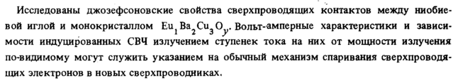 Исследованы джозефсоновские свойства сверхпроводящих контактов между ниобие-в ой иглой и монокристаллом Ей В а Си О. Вольт-амперные характеристики и зависи-мости индуцированных СВЧ излучением ступенек тока на них от мощности излучения по-видимому могут служить указанием на обычный механизм спаривания сверхпроводящих электронов в новых сверхпроводниках.