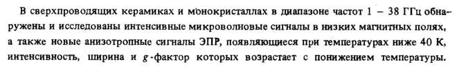В сверхпроводящих керамиках и монокристаллах в диапазоне частот 1-38 ГГц обнаружены и исследованы интенсивные микроволновые сигналы в низких магнитных полях, а также новые анизотропные сигналы ЭПР, появляющиеся при температурах ниже 40 К, интенсивность, ширина и g-фактор которых возрастает с понижением температуры.