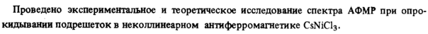 Проведено экспериментальное и теоретическое исследование спектра АФМР при опрокидывании подрешеток в неколлинеарном антиферромагнетике CSN1CI3.