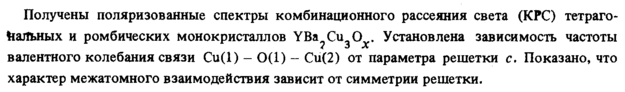 Получены поляризованные спектры комбинационного рассеяния света (КРС) тетрагональных и ромбических монокристаллов YBa Си О Установлена зависимость частоты валентного колебания связи Си(1) 0(1) Си(2) от параметра решетки с. Показано, что характер межатомного взаимодействия зависит от симметрии решетки.