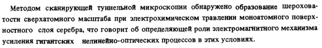 Методом сканирующей туннельной микроскопии обнаружено образование шероховатости сверхатомного масштаба при электрохимическом травлении моноатомного поверхностного слоя серебра, что говорит об определяющей роли электромагнитного механизма усиления гигантских нелинейно-оптических процессов в этих условиях.
