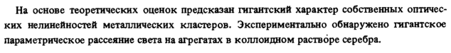 На основе теоретических оценок предсказан гигантский характер собственных оптических нелинейностей металлических кластеров. Экспериментально обнаружено гигантское параметрическое рассеяние света на агрегатах в коллоидном растворе серебра.