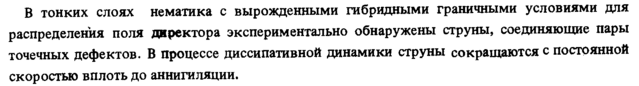 В тонких слоях нематика с вырожденными гибридными граничными условиями для распределения поля директора экспериментально обнаружены струны, соединяющие пары точечных дефектов. В процессе диссипативной динамики струны сокращаются с постоянной скоростью вплоть до аннигиляции.