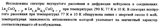 Исследованы спектры неупругого рассеяния и дифракции нейтронов в соединениях La2Cu°4 у и Lai,8Sr0,2CuO4 у при температура 290 К, 77 К и 10 К. В спектрах неупругого рассеяния при температурах 77 К и 10 К обнаружена линия с энергией около 6 мэВ, температурная зависимость интенсивности которой указывает на магнитный характер соответствующего ей возбуждения.