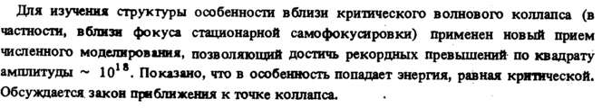 Для изучения структуры особенности вблизи критического волнового коллапса (в частности, вблизи фокуса стационарной самофокусировки) применен новый прием численного моделирования, позволяющий достичь рекордных превышений по квадрату амплитуды ~ 1018. Показано, что в особенность попадает энергия, равная критической. Обсуждается закон приближения к точке коллапса.