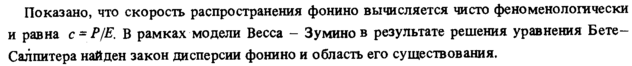 Показано, что скорость распространения фонино вычисляется чисто феноменологически и равна с = Р/Е. В рамках модели Весса Зумино в результате решения уравнения Бете-Салпитера найден закон дисперсии фонино и область его существования.