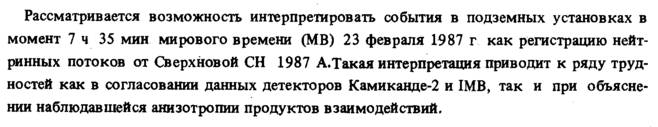 Рассматривается возможность интерпретировать события в подземных установках в момент 7 ч 35 мин мирового времени (MB) 23 февраля 1987 г как регистрацию нейтринных потоков от Сверхновой СН 1987 А.Такая интерпретация приводит к ряду трудностей как в согласовании данных детекторов Камиканде-2 и 1MB, так и при объяснении наблюдавшейся анизотропии продуктов взаимодействий.
