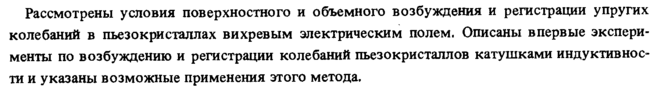 Рассмотрены условия поверхностного и объемного возбуждения и регистрации упругих колебаний в пьез о кристалл ах вихревым электрическим полем. Описаны впервые эксперименты по возбуждению и регистрации колебаний пьез о кристаллов катушками индуктивности и указаны возможные применения этого метода.