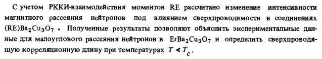 С учетом РККИ-взаимо действия моментов RE рассчитано изменение интенсивности магнитного рассеяния нейтронов под влиянием сверхпроводимости в соединениях (RE)Ba2Cu307 » Полученные результаты позволяют объяснить экспериментальные данные для малоуглового рассеяния нейтронов в ЕгВа2Сиз07 и определить сверхпроводящую корреляционную длину при температурах Τ <Т ,