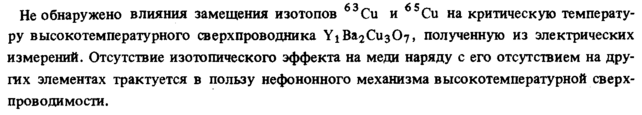 Не обнаружено влияния замещения изотопов Си и Си на критическую температуру высокотемпературного сверхпроводника Ύ iB3.2Cu^O-j t полученную из электрических измерений. Отсутствие изотопического эффекта на меди наряду с его отсутствием на других элементах трактуется в пользу нефононного механизма высокотемпературной сверхпроводимости.