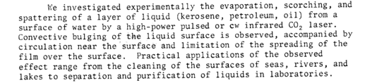We investigated experimentally the evaporation, scorching, and spattering of a layer of liquid (kerosene, petroleum, oil) from a surface of water by a high-power pulsed or cw infrared C02 laser. Convective bulging of the liquid surface is observed, accompanied by circulation near the surface and limitation of the spreading of the film over the surface. Practical applications of the observed effect range from the cleaning of the surfaces of seas, rivers, and lakes to separation and purification of liquids in laboratories.