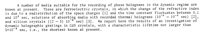 A number of media suitable for the recording of phase holograms in the dynamic regime are known at present. These are ferroelectric crystals, in which the change of the refractive index is due to a redistribution of the space charges [1] and the time constant fluctuates between 0.1 and 103 sec, solutions of absorbing media with recorded thermal holograms (10"ц — 10~6 sec) [2], and silicon crystals ((2 —3) 10 sec) [3]. We report here the results of an investigation of dynamic holographic gratings in CdS crystals, with a characteristic lifetime not larger than 5xl0~9 sec, i.e., the shortest known at present.