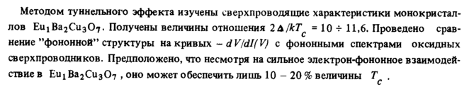 Методом туннельного эффекта изучены сверхпроводящие характеристики монокристаллов Еи1Ва2Сиз07. Получены величины отношения 2&/кТ = 10 -f 11,6. Проведено срав-нение "фононной" структуры на кривых d V/dlf V) с фононными спектрами оксидных сверхпроводников. Предположено, что несмотря на сильное электрон-фононное взаимодействие в Eu1Ba2Cu307 , оно может обеспечить лишь 10 20 % величины Τ . с