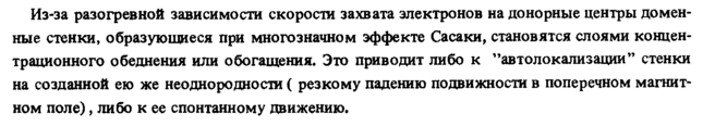 Из-за разогревной зависимости скорости захвата электронов на донорные центры доменные стенки, образующиеся при многозначном эффекте Сасаки, становятся слоями концентрационного обеднения или обогащения. Это приводит либо к "автолокализации" стенки на созданной ею же неоднородности ( резкому падению подвижности в поперечном магнитном поле), либо к ее спонтанному движению.