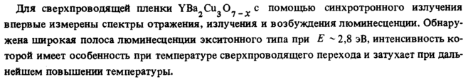 Для сверхпроводящей пленки YBa Си О с помощью синхротронного излучения впервые измерены спектры отражения, излучения и возбуждения люминесценции. Обнаружена широкая полоса люминесценции экситонного типа при Ε 2,8 эВ, интенсивность которой имеет особенность при температуре сверхпроводящего перехода и затухает при дальнейшем повышении температуры.