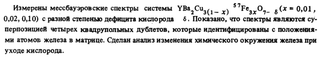Измерены мессбауэровские спектры системы YBa2Cu3(i_ х) 57ре3х°7_ $(* = 0,01 ^ 0,02, 0,10) с разной степенью дефицита кислорода δ, Показано, что спектры являются суперпозицией четырех квадрупольных дублетов, которые идентифицированы с положениями атомов железа в матрице. Сделан анализ изменения химического окружения железа при уходе кислорода.