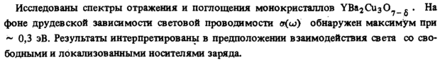 Исследованы спектры отражения и поглощения монокристаллов УВа2Сиз07 ^ . На фоне друдевской зависимости световой проводимости обнаружен максимум при ~ 0,3 эВ. Результаты интерпретированы в предположении взаимодействия света со свободными и локализованными носителями заряда.