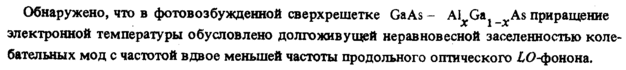 Обнаружено, что в фотовозбужденной сверхрешетке GaAs ΑΙ Ga As приращение электронной температуры обусловлено долго жив у щей неравновесной заселенностью колебательных мод с частотой вдвое меньшей частоты продольного оптического Ζ-0-фонона.