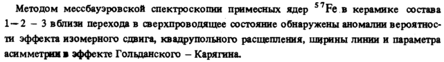 Методом мессбауэровской спектроскопии примесных ядер 57Fe в керамике состава 1—2-3 вблизи перехода в сверхпроводящее состояние обнаружены аномалии вероятности эффекта изомерного сдвига, квадрупольного расщепления, ширины линии и параметра асимметрии в эффекте Гольданского Карягина.