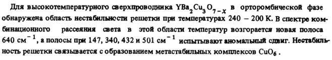 Для высокотемпературного сверхпроводника YBa2Cu30?_^ в орторомбической фазе обнаружена область нестабильности решетки при температурах 240 200 К. В спектре комбинационного рассеяния света в этой области температур возгорается новая полоса 640 см" а полосы при 147, 340, 432и501см-1 испытывают аномальный сдвиг. Нестабильность решетки связывается с образованием метастабильных комплексов СиО$ .