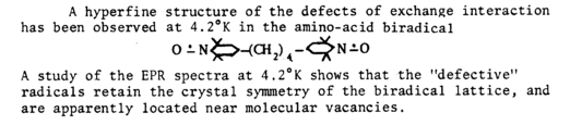 A hyperfine structure of the defects of exchange interaction has been observed at 4.2°K in the amino-acid biradical o^n£>4CH2)4-<^n.io A study of the EPR spectra at 4.2°K shows that the "defective" radicals retain the crystal symmetry of the biradical lattice, and are apparently located near molecular vacancies.