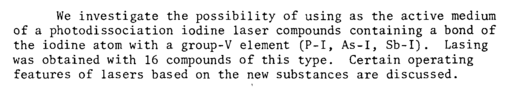 We investigate the possibility of using as the active medium of a photodissociation iodine laser compounds containing a bond of the iodine atom with a group-V element (P-I, As-I, Sb-I). basing was obtained with 16 compounds of this type. Certain operating features of lasers based on the new substances are discussed.