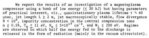 We report the results of an investigation of a raagnetoplasma compressor using a bank of low energy (< 30 kJ) but having parameters of practical interest, viz., quasistationary plasma lifetime τ ^ 40 ysec, jet length L > 2 m, jet macroscopically stable, flow divergence θ < 10°, impurity concentration in the central compression zone α < 0.5%, Te < 11 eV, N£ < 5*1017 cm"3, and Wi < 200 eV. Regimes are observed in which half the energy fed to the discharge is released in the form of radiation (mainly in the vacuum ultraviolet).