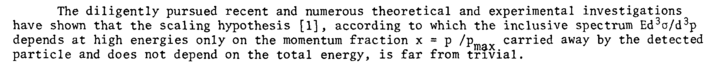 The diligently pursued recent and numerous theoretical and experimental investigations have shown that the scaling hypothesis [1], according to which the inclusive spectrum Ed3o/d3p depends at high energies only on the momentum fraction χ = ρ /pm^x carried away by the detected particle and does not depend on the total energy, is far from trivial.
