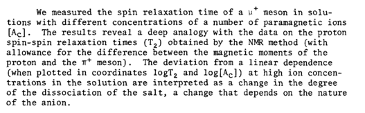 We measured the spin relaxation time of a μ+ meson in solutions with different concentrations of a number of paramagnetic ions [Ac]. The results reveal a deep analogy with the data on the proton spin-spin relaxation times (T2) obtained by the NMR method (with allowance for the difference between the magnetic moments of the proton and the π+ meson). The deviation from a linear dependence (when plotted in coordinates logT2 and log[Ac]) at high ion concentrations in the solution are interpreted as a change in the degree of the dissociation of the salt, a change that depends on the nature of the anion.