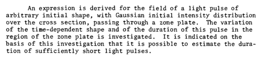 An expression is derived for the field of a light pulse of arbitrary initial shape, with Gaussian initial intensity distribution over the cross section, passing through a zone plate. The variation of the time-dependent shape and of the duration of this pulse in the region of the zone plate is investigated. It is indicated on the basis of this investigation that it is possible to estimate the duration of sufficiently short light pulses.