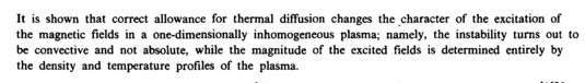 It is shown that correct allowance for thermal diffusion changes the character of the excitation of the magnetic fields in a one-dimensionally inhomogeneous plasma; namely, the instability turns out to be convective and not absolute, while the magnitude of the excited fields is determined entirely by the density and temperature profiles of the plasma.