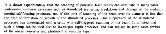 It is shown experimentally that the scanning of powerful laser beams can eliminate in many cases undesirable nonlinear processes such as stimulated scattering, breakdown and damage of the medium, inertial self-focusing processes, etc., if the time of scanning of the beam over its diameter is less than the time of formation or growth of the stimulated processes. This suppression of the stimulated processes was investigated with a setup with self-triggered scanning of the beam. It is noted that such a setup can be used also to investigate rapid processes and can replace in some cases devices of the image converter and photoelectric recorder type.