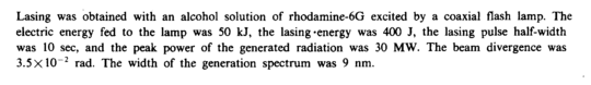 Lasing was obtained with an alcohol solution of rhodamine-6G excited by a coaxial flash lamp. The electric energy fed to the lamp was 50 kJ, the lasing-energy was 400 J, the lasing pulse half-width was 10 sec, and the peak power of the generated radiation was 30 MW. The beam divergence was 3.5χ10~2 rad. The width of the generation spectrum was 9 nm.