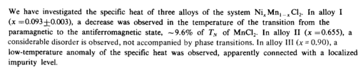 We have investigated the specific heat of three alloys of the system NiJCMn1_xCl2. In alloy I (x =0.093+0.003), a decrease was observed in the temperature of the transition from the paramagnetic to the antiferromagnetic state, —9.6% of 7^ of MnCl2. In alloy II (x =0.655), a considerable disorder is observed, not accompanied by phase transitions. In alloy III (jc = 0.90), a low-temperature anomaly of the specific heat was observed, apparently connected with a localized impurity level.