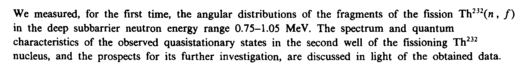 We measured, for the first time, the angular distributions of the fragments of the fission Th232(n, /) in the deep subbarrier neutron energy range 0.75-1.05 MeV. The spectrum and quantum characteristics of the observed quasistationary states in the second well of the fissioning Th232 nucleus, and the prospects for its further investigation, are discussed in light of the obtained data.