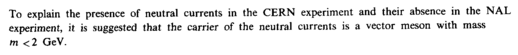 To explain the presence of neutral currents in the CERN experiment and their absence in the NAL experiment, it is suggested that the carrier of the neutral currents is a vector meson with mass m <2 GeV.