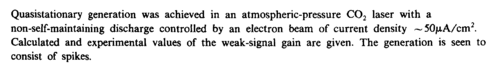 Quasistationary generation was achieved in an atmospheric-pressure C02 laser with a non-self-maintaining discharge controlled by an electron beam of current density ~50μΑ/αη2. Calculated and experimental values of the weak-signal gain are given. The generation is seen to consist of spikes.