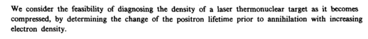 We consider the feasibility of diagnosing the density of a laser thermonuclear target as it becomes compressed, by determining the change of the positron lifetime prior to annihilation with increasing electron density.