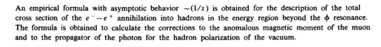 An empirical formula with asymptotic behavior ~(l/s) is obtained for the description of the total cross section of the e ~ — e + annihilation into hadrons in the energy region beyond the φ resonance. The formula is obtained to calculate the corrections to the anomalous magnetic moment of the muon and to the propagator of the photon for the hadron polarization of the vacuum.