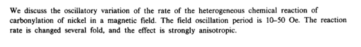 We discuss the oscillatory variation of the rate of the heterogeneous chemical reaction of carbonylation of nickel in a magnetic field. The field oscillation period is 10-50 Oe. The reaction rate is changed several fold, and the effect is strongly anisotropic.