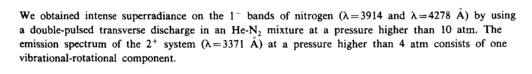 We obtained intense superradiance on the 1" bands of nitrogen (λ=3914 and λ=4278 A) by using a double-pulsed transverse discharge in an He-N2 mixture at a pressure higher than 10 atm. The emission spectrum of the 2+ system (λ=3371 A) at a pressure higher than 4 atm consists of one vibrational-rotational component.