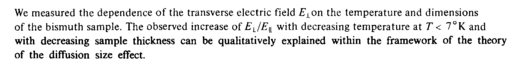 We measured the dependence of the transverse electric field £χοη the temperature and dimensions of the bismuth sample. The observed increase of EJE^ with decreasing temperature at Τ < 7°K and with decreasing sample thickness can be qualitatively explained within the framework of the theory of the diffusion size effect.