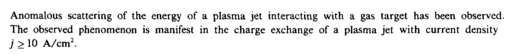 Anomalous scattering of the energy of a plasma jet interacting with a gas target has been observed. The observed phenomenon is manifest in the charge exchange of a plasma jet with current density j > 10 A/cm2.