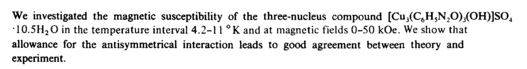 We investigated the magnetic susceptibility of the three-nucleus compound [CUj(C6H5N20)3(OH)]S04 •10.5H2O in the temperature interval 4.2-11 °K and at magnetic fields 0-50 kOe. We show that allowance for the antisymmetrical interaction leads to good agreement between theory and experiment.