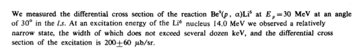 We measured the differential cross section of the reaction Be9(/>, a)Li6 at Ερ = 30 MeV at an angle of 30° in the Λί. At an excitation energy of the Li6 nucleus 14,0 MeV we observed a relatively narrow state, the width of which does not exceed several dozen keV, and the differential cross section of the excitation is 200+60 μοΛη