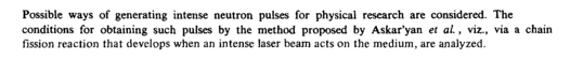 Possible ways of generating intense neutron pulses for physical research are considered. The conditions for obtaining such pulses by the method proposed by Askar'yan et al., viz., via a chain fission reaction that develops when an intense laser beam acts on the medium, are analyzed.