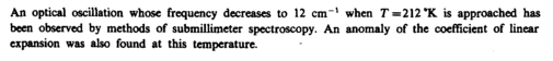 An optical oscillation whose frequency decreases to 12 cm"' when X=212°K is approached has been observed by methods of submillimeter spectroscopy. An anomaly of the coefficient of linear expansion was also found at this temperature.